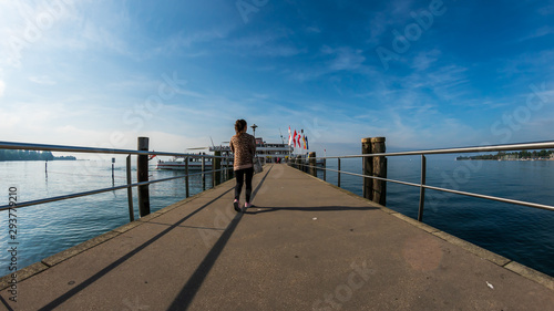 Obraz premium A Woman walking on the pier at Kressbronn am Bodensee