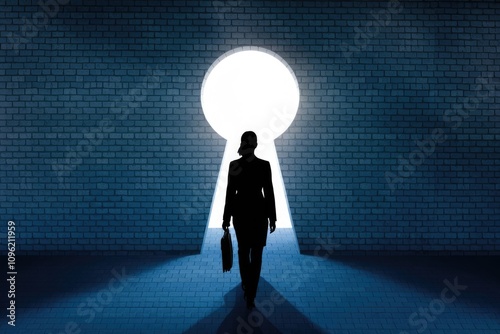 © Vibu design gallery, Obraz premium A woman walks through a keyhole shaped opening in a brick wall representing opportunity.