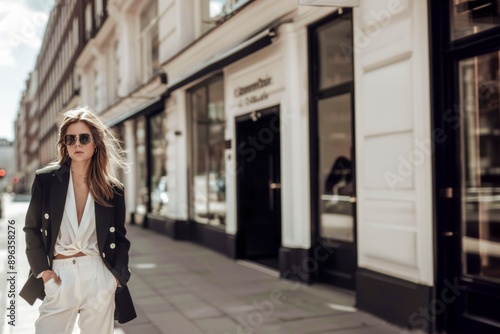 © larrui, Fototapeta premium A woman wearing a black jacket and white pants walks down a street in front of a store