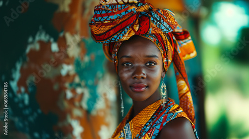 © Meritxell Cid, Fototapeta premium A woman wearing a colorful head scarf and earrings