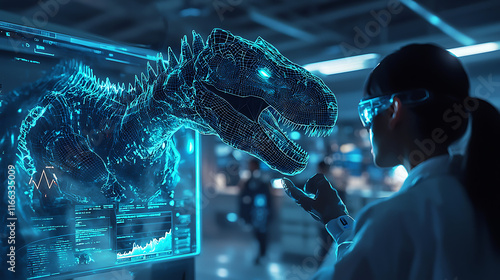 © Winyou, Obraz premium A woman wearing a lab coat is looking at a computer screen with a dinosaur on it