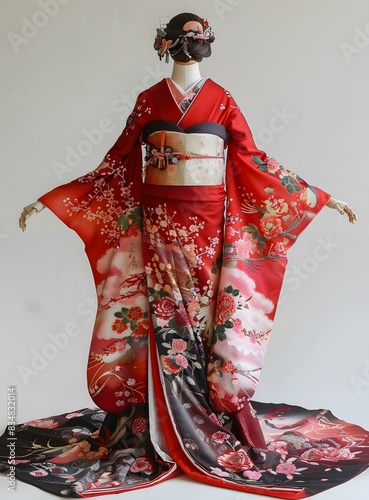Naklejka premium A woman wearing a red kimono with floral patterns