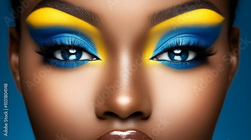 Fototapeta premium A woman wearing blue-yellow makeup on her face
