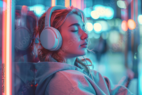 © Nam, Obraz premium a woman wearing headphones is sitting on a bus