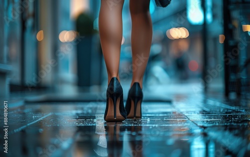 Fototapeta premium A woman wearing high heels walks down a wet street. The image has a moody and mysterious feel to it, as the wet pavement and the reflection of the lights create a sense of depth and atmosphere