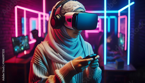© MohamadMustafa, Obraz premium A woman wearing VR goggles, standing in a room, fully absorbed in a virtual world, surrounded by neon lights.