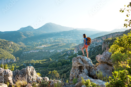 © zhukovvvlad, Obraz premium A woman with a backpack stands on top of a mountain and admires the beauty of a mountain valley.