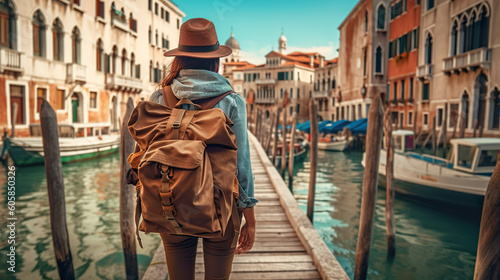 © tilialucida, Obraz premium A woman with a backpack walking down a bridge in city. Generative AI.
