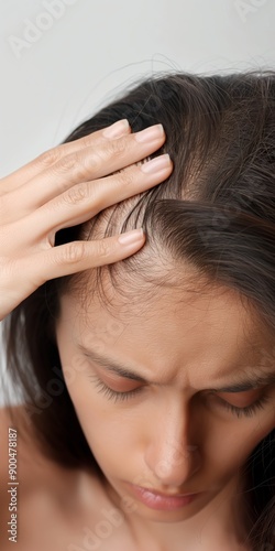 Naklejka premium A woman with a bald spot on her head is looking up. She is wearing a black shirt and has her hand on her head