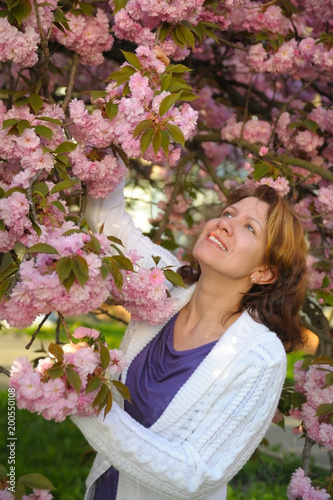 © Мар'ян Філь, Fototapeta premium A woman with a beautiful smile is happy in the spring. She enjoys the flowering of sakura