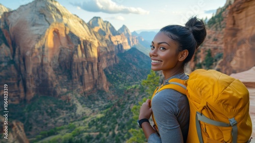 © Elmin, Naklejka premium A woman with a bright yellow backpack smiles happily as she takes in the breathtaking view of the towering mountains. This is a perfect example of an active lifestyle, full of adventure and travel.