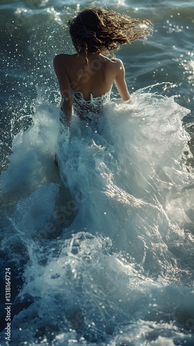Obraz premium 46. **A woman with a dress made of flowing water, blending into the ocean**