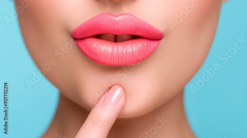 © Trushchenko_O, Obraz premium A woman with a pink lip is shown with her finger on her lips. Concept of mystery and secrecy, as if the woman is trying to keep her lips hidden from view
