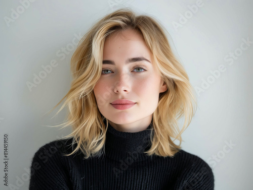 © VISUAL BACKGROUND, Fototapeta premium A woman with blonde hair wearing a black turtleneck sweater.