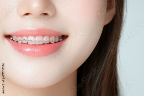 © Nijieimu, Fototapeta premium A woman with braces on her teeth is smiling