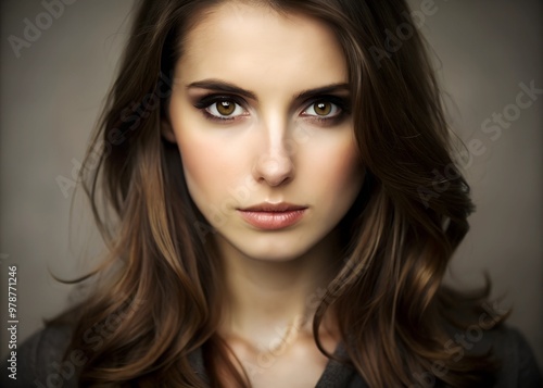 © Yauhen, Fototapeta premium A woman with brown hair and brown eyes is looking directly at the camera