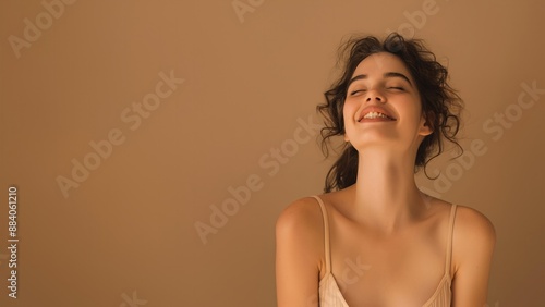 © Darya, Obraz premium A woman with closed eyes and a relaxed expression, enjoying a moment of serenity against a beige background, perfect for themes of calm and mindfulness.