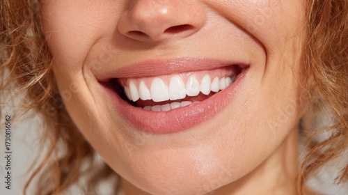 © mila103, Obraz premium A woman with curly hair displays a bright smile highlighting her white teeth and joyful expression. Sunlight enhances her cheerful demeanor and creates a warm atmosphere.
