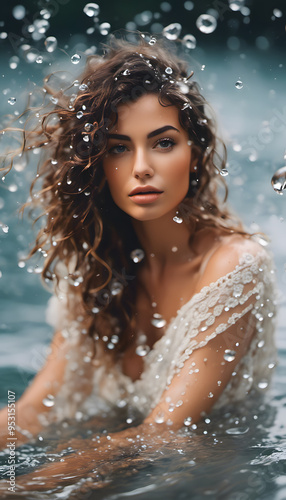 © Janos, Obraz premium A woman with curly hair is partially submerged in water, surrounded by droplets. She has a serene expression and is wearing a light, lacy top. The background is blurred, creating a dreamy atmosphere.