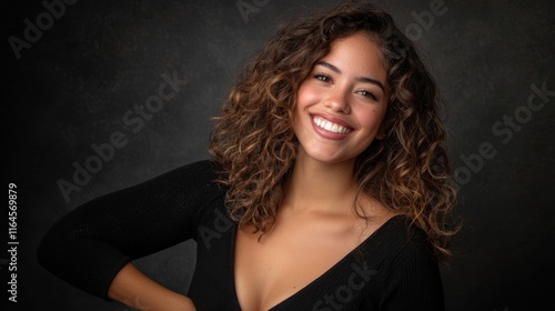 Fototapeta premium A woman with curly hair is smiling and posing for a photo