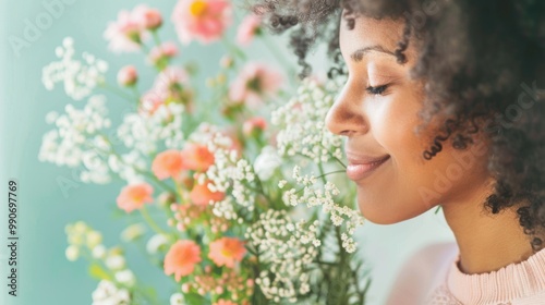 Fototapeta premium A woman with curly hair takes a moment to appreciate the delightful scent of fresh flowers in a bright room