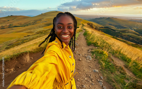 Naklejka premium A woman with dreadlocks smiles while taking a selfie on a mountain trail. The...