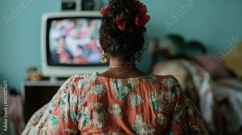 Obraz premium A woman with flowers in her hair is seen from the back watching television in...