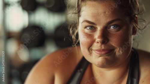 © iuricazac, Fototapeta premium A woman with freckles and blue eyes smiling at the camera wearing a black top with a blurred background.