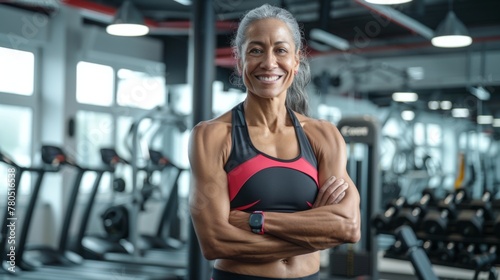 Fototapeta premium A woman with gray hair wearing a black and red sports top smiling and posing confidently in a gym with exercise equipment in the background.