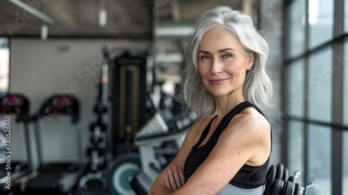 © iuricazac, Obraz premium A woman with gray hair wearing a black sports bra standing in a gym with a smile on her face surrounded by various exercise equipment.