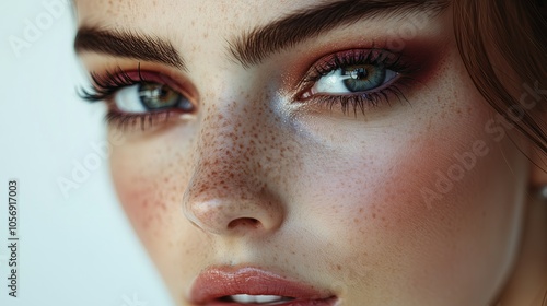 Fototapeta premium A woman with green eyes and red hair is wearing makeup. She has a red nose...