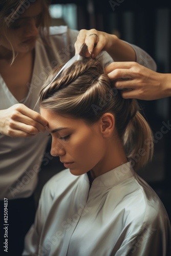 Naklejka premium A woman with her hair being styled by a stylist. The stylist is using a comb...