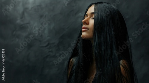 Fototapeta premium A woman with long black hair and closed eyes, turning to the right, set...