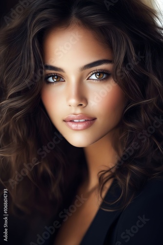 © VISUAL BACKGROUND, Fototapeta premium A woman with long brown hair and a black top