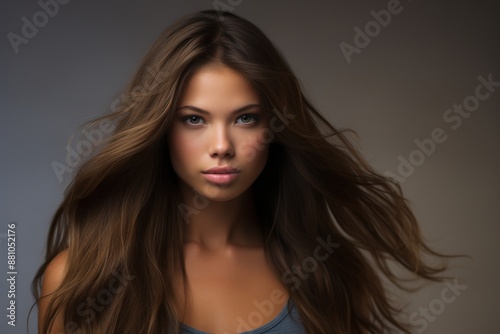 Fototapeta premium A woman with long brown hair and a blue shirt