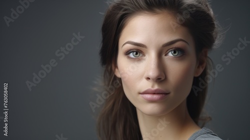 Obraz premium A woman with long brown hair and blue eyes. Suitable for beauty and fashion...