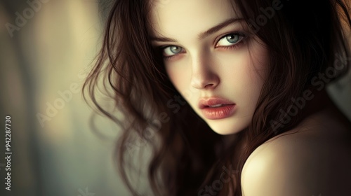 © starush, Fototapeta premium A woman with long brown hair posing for a picture, AI