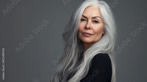 © liliyabatyrova, Fototapeta premium A woman with long gray hair is smiling for the camera