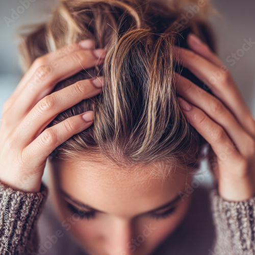 Fototapeta premium A woman with long hair holds her head in distress, conveying a sense of...