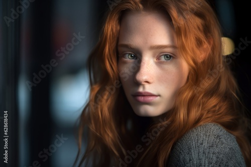 Fototapeta premium a woman with long red hair looking at the camera