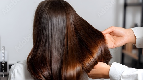 Fototapeta premium A woman with long, shiny brown hair is being styled by a professional...