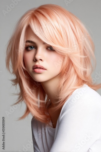 © Mrammon, Fototapeta premium A woman with pink hair is sitting in a white shirt