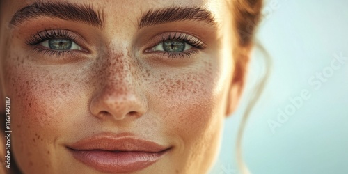 Fototapeta premium A woman with striking green eyes and freckles smiles warmly while basking in sunlight, showcasing her natural beauty against a scenic backdrop