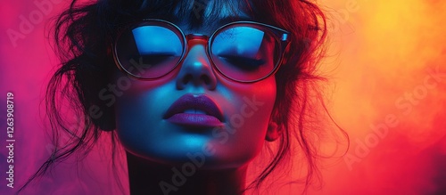 Obraz premium A woman with stylish sunglasses poses dramatically against a vibrant,...