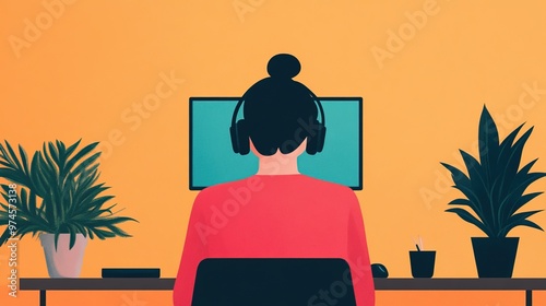 © Moonroad, Fototapeta premium A woman working on a computer with headphones, surrounded by plants, against a vibrant orange wall, representing remote work and focus.