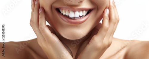 © Fox, Obraz premium A womans radiance shines through her confident smile and clear, healthy skin. Taking care of her skin and lifestyle enhances her beauty and grace naturally, uplifting her appearance