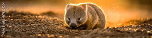 © Abdul, Fototapeta premium A wombat digging in golden hour light, fur details sharp, earthy background
