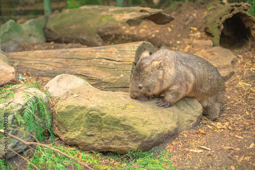 Naklejka premium A wombat, Vombatus ursinus, walks in the wilderness in Tasmania scenery outside. The wombat is a herbivorous marsupial.