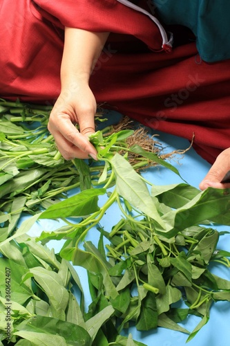 © Ika Rahma, Obraz premium A Women Pick Water Spinach Stem before CUtting, Preparing Cooking