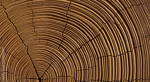 © Zahra, Fototapeta premium A wood crosssection reveals concentric growth rings and radial splits
